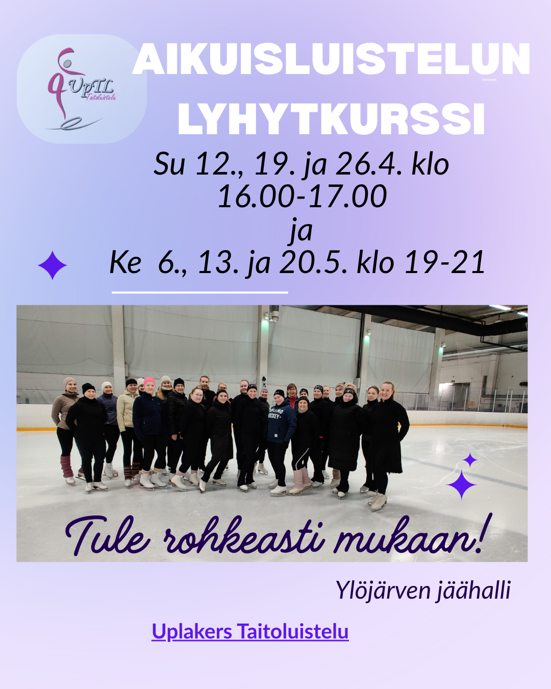 Ryhmä jaetaan alkeis- ja jatkoryhmään, joten kaiken tasoiset taitoluistelusta ja muodostelmaluistelusta kiinnostuneet aikuiset voivat ilmoittautua mukaan.